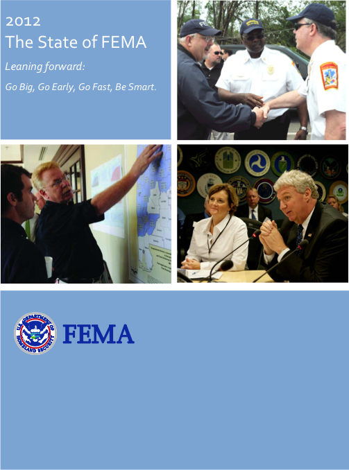 Today FEMA released “The State of FEMA” as an overview of FEMA’s vision and strategy (with a lot of Whole Community approach). It’s a smart idea, especially since (as the report quickly mentions) FEMA responded to more disasters in 2011 than ever before (98 major disaster declarations, 26 emergency declarations, and 112 fire management assistance grant (FMAG) declarations). There’s no doubt FEMA has been undergoing a profound transformation under Mr. Fugate and it’s pretty impressive. Among all else, Mr. Fugate has transitioned FEMA from a federal response to a NATIONAL response (with national planning/preparedness and prevention/protection efforts now in full swing).