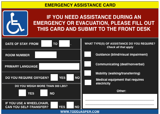 My policy recommendation is that every state, county, city, and community pass a law requiring all hotels/motels, residence halls, high-rise buildings, and other high-occupancy buildings/structures/campuses to distribute a single, double-sided 5×7 inch paper card to all visitors that includes emergency response information as well as a form for visitors to self-identify as needing assistance during emergencies and evacuations.