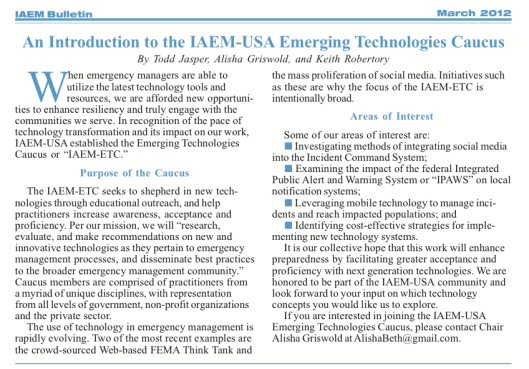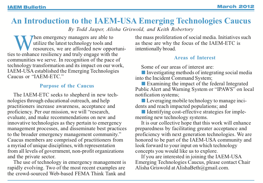 An Introduction to the IAEM-USA Emerging Technologies Caucus 25 Sunday Mar 2012 Posted by toddjasper in EMERGENCY MANAGEMENT ≈ Leave a comment An Excerpt from the March 2012 Bulletin of the International Association of Emergency Managers (IAEM) Share this: Click to email a link to a friend (Opens in new window) Email Click to share on X (Opens in new window) X Click to share on Facebook (Opens in new window) Facebook Click to share on Pinterest (Opens in new window) Pinterest Click to share on Reddit (Opens in new window) Reddit Like Loading... Related